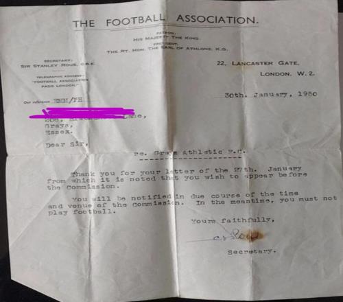 长话短说,格雷斯竞技队被怀疑发放靴钱。这封信证实了我爷爷愿意参与委员会的调查。在调查结果出来之前,他被禁止参赛。
