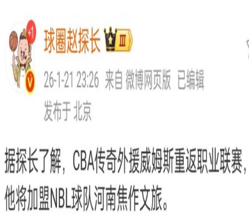 正式确定!威姆斯重返赛场,携手CBA名将,全力击季后赛